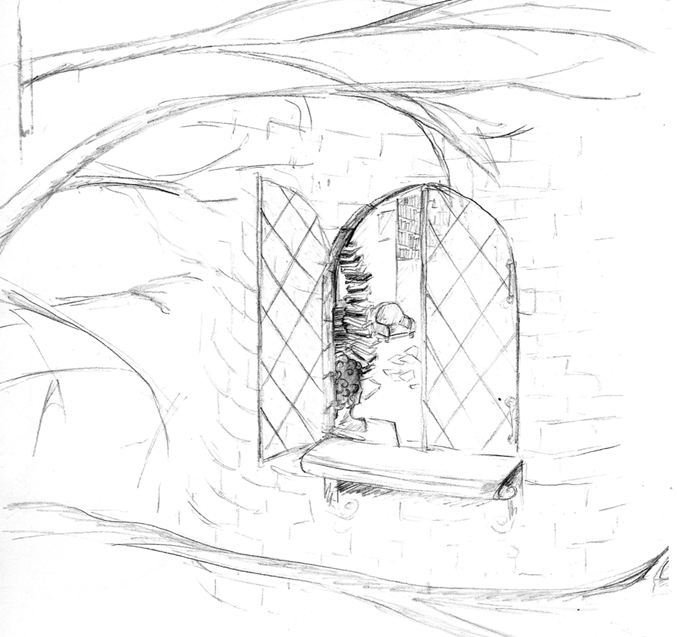 It landed on a windowsill, peering in at the man who sat beyond the pane. He was frail-looking, with a bony face and paper-thin skin stretched over his skeleton like a sheet. He was bent over some heavy volume splayed open on his desk.